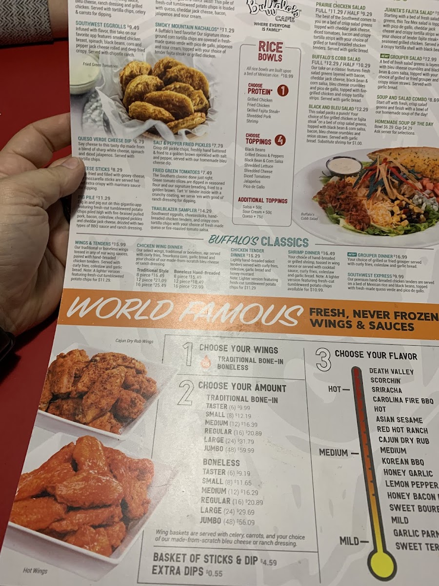 hand-breaded chicken tenders • medium wing sauce • Mexican rice • lettuce • pico de gallo • ranch dressing.
